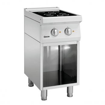 Sporák elektrický s otevřenou spodní konstrukcí má 2 varné zóny, typ sklo-keramika. Varná deska SCHOTT CERAN. Materiál: CNS 18/10. Robustní konstrukce, jednoduchá údržba. Profesionální elektrický sporák pro velkokapacitní kuchyně, stravovací provozy. Provozní režim: elektrický 2 varné zóny– sklo keramika Příkon: 4,6 kW / 400 V / 50 Hz / připojení 3 NAC. Rozdělení varných zón 2 x 2,3 kW. Průměr 2 x 210 mm. Nastavitelné nohy od 850 do 900 mm. Rozměr: Š 400 x H 700 x V 850 mm. Hmotnost: 32,6 kg