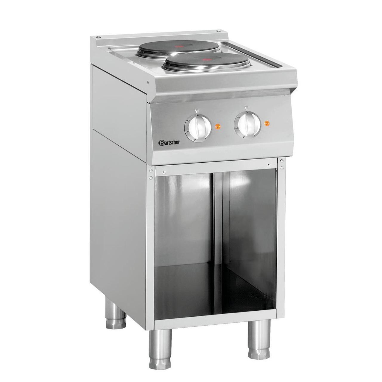 Sporák s otevřenou spodní konstrukci. Sporák elektrický má 2 varné kulaté plotýnky. Materiál: CNS 18/10. Provozní režim: elektrický 2 elektrické plotýnky Příkon: 5,2 kW / 400 V / 50 Hz / připojení 3 NAC. Rozdělení varných zón 2 x 2,6 kW. Průměr 220 mm. Nastavitelné nohy od 850 do 900 mm. Rozměr: Š 400 x H 700 x V 850 mm. Hmotnost: 36 kg. Na vyžádání lze dodat s hranatými plotýnkami.