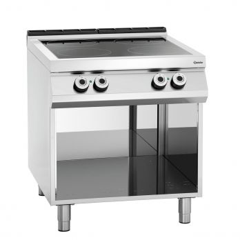 Elektrická sporák 4 plotýnkový s otevřeným podstavce. Varná plocha skleněná. Sporák volně stojící v kvalitním nerezovém provedení. Stabilní nožky s nastavitelnou výškou. Materiál CNS 18/10. Provozní režim: elektrický. Varná plocha: keramické sklo. Spodní konstrukce: otevřená. 4 varné plochy skleněné. Rozložení 4 x 4 kW, průměr 265 mm. Nastavitelné nohy od 900 do 950 mm. Teplotní rozpětí od 70 do 300 °C. Příkon: 16 kW / 400 V / 50/60 Hz, 3 NAC. Rozměr: Š 800 x H 900 x V 900 mm. Hmotnost: 61,6 kg.
