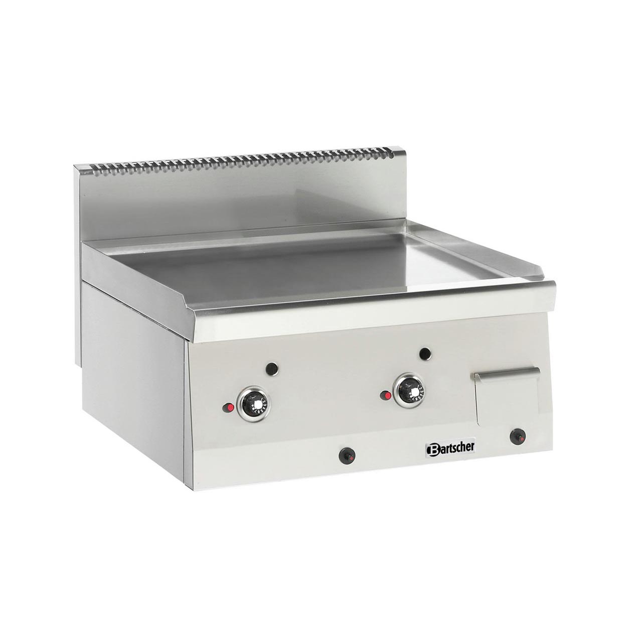 Stolní grilovací plynová deska se 2 tepelnými zónami samostatně regulovatelnými v hladkém provedení. Stolní gril na zkapalněný plyn. Materiál CNS 18/10. Provozní režim: plyn. Piezo zapalování. 2x tepelná zóna. Samostatně regulovatelné. Plocha na smažení: speciální ocel, tvrdě pochromovaná, hladká, rozměr: Š 590 x H 440 mm. Součástí sady jsou trysky pro zemní plyn. Nádoba na sběr tuku. Příkon: 7,6 kW. Rozměr: Š 600 x H 600 x V 290 mm. Hmotnost: 49 kg.