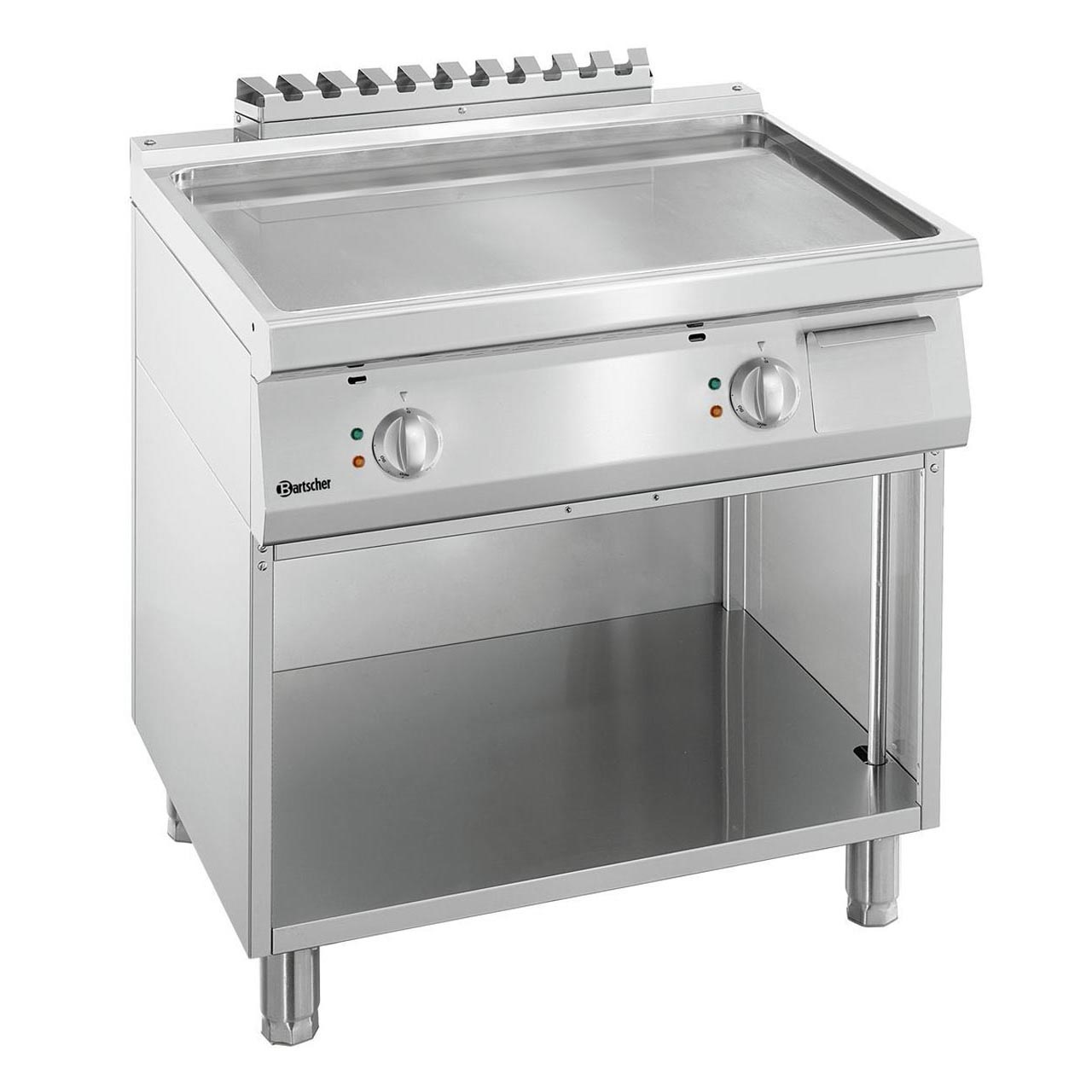 Elektrická grilovací deska se 2 topnými zónami hladké provedení z oceli. Materiál: CNS 18/10. Robustní konstrukce, jednoduchá údržba. Profesionální elektrická grilovací deska pro velkokapacitní kuchyně, stravovací provozy. Provozní režim: elektrický 2x topná zóna, ocel – vroubkovaná deska, rozměr: Š 720 x H 445 mm. Příkon: 10 kW / 400 V / 50 Hz, připojení 3 NAC. Kontrolka nahřátí, ZAP/VYP, bezpečnostní termostat. Nastavitelné nohy od 850 do 900 mm. Rozměr: Š 800 x H 700 x V 850 mm. Hmotnost: 70,8 kg.