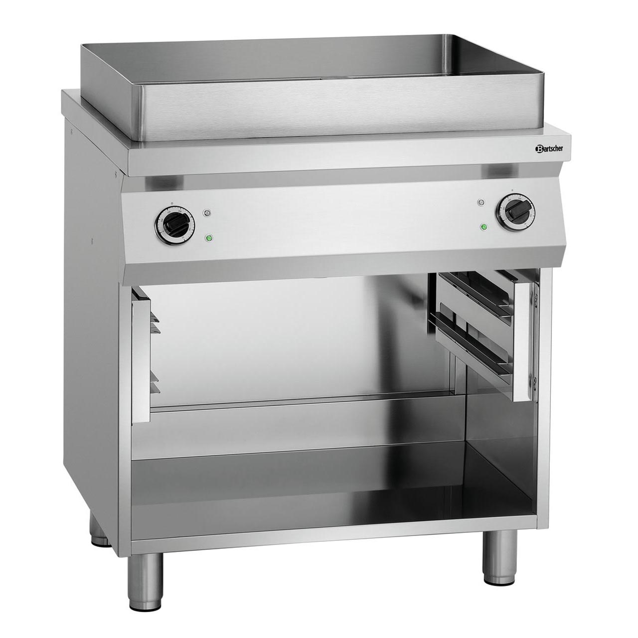 Volně stojící zařízení s velkou kapacitou 20 litrů s otevřeným podstavcem Š 750 x H 500 x V 470 mm na nastavitelných nožičkách (od 850 do 900 mm). Materiál ušlechtilá ocel. Samostatně 2 ovládací topné zóny (výkon pro zónu 3,3 kW). Příkon 6,6 kW / 400 V. Výpustný otvor. Teplotní rozmezí od 30 do 290 °C. Kontrolka zahřátí / provozu. Pekáč ocelový Š 750 x H 560 x V 80 mm, síla desky 12 mm. Součástí dodávky 1 špachtle a těsnící zátka. Vlastnosti: ochrana proti stříkající vodě svařená po celém obvodu. Spodní konstrukce se zásuvy pro GN 2/1. Celkový rozměr: Š 800 x H 712 x V 980 mm. Hmotnost 95 kg.