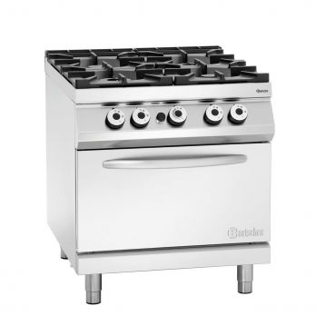 Sporák plynový se 4 hořáky s plynovou troubou GN 2/1. Plynový sporák volně stojící v kvalitním nerezovém provedení. Stabilními nožky s nastavitelnou výškou. Materiál CNS 18/10. Provozní režim: plyn. Varná plocha: plyn. 4 hořáky, rozložení: 1 x 3,5 kW, 1 x 5 kW, 2 x 8 kW. Plynová trouba GN 2/1, rozměr: Š 655 x H 550 x V 300 mm. Připojení 8 kW. Nastavitelné nohy od 900 do 950 mm. Teplotní rozpětí od 60 do 300 °C. Vlastnosti trouby: Piezo-zapalování. Na zemní plyn. Součástí jsou trysky na kapalný plyn (50 mbar) a trysky na zemní plyn L (20 mbar). Dvouokruhový hořák, ruční zapalování. Odnímatelná odkapávací miska pod hořáky. Příkon: 32,5 kW. Rozměr: Š 800 x H 900 x V 900 mm. Hmotnost: 146,4 kg.