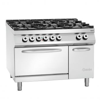 Sporák plynový se 6 hořáky s elektrickou troubou a skříňkou. Plynový sporák volně stojící v kvalitním nerezovém provedení. Stabilními nožky s nastavitelnou výškou. Materiál CNS 18/10. Provozní režim: elektrika / plyn. Varná plocha: plyn. 6 hořáků, rozložení: 1 x 3,5 kW, 2 x 5 kW, 3 x 8 kW Elektrická trouba GN 2/1, rozměr: Š 655 x H 550 x V 300 mm. Připojení 5,6 kW. Spodní skříňka: Š 345 x H 835 x V 470 mm. Křídlové dveře. Nastavitelné nohy od 900 do 950 mm. Teplotní rozpětí od 70 do 300 °C. Na zemní plyn. Součástí jsou trysky na kapalný plyn (50 mbar) a trysky na zemní plyn L (20 mbar). Dvouokruhový hořák, ruční zapalování. Odnímatelná odkapávací miska pod hořáky. Příkon: 37,5 kW, 400 W, 50/60 HZ, 3 NAC. Rozměr: Š 1200 x H 900 x V 900 mm. Hmotnost: 186,6 kg.