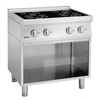 Elektrický sporák s otevřenou spodní konstrukci. Sporák elektrický má 4 varné zóny, typ sklo-keramika. Varná deska SCHOTT CERAN®. Materiál: CNS 18/10. Robustní konstrukce, jednoduchá údržba. Provozní režim: elektrický 4 varné zóny – sklo keramika Příkon: 9,2 kW / 400 V / 50 Hz / připojení 3 NAC. Rozdělení varných zón 4 x 2,3 kW. Průměr 4 x 210 mm. Nastavitelné nohy od 850 do 900 mm. Rozměr: Š 800 x H 700 x V 850 mm. Hmotnost: 50 kg