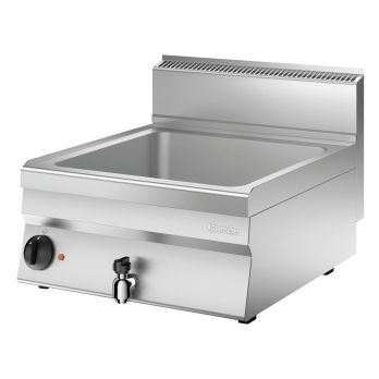 Stolní vodní lázeň řady 650 Bartscher pro profi kuchyně. Pro gastronádoby GN 1/1 a 2x 1/4 hloubky 150 mm. Elektrická vodní lázeň s výpustným kohoutem. Určena pro nepřetržitý provoz.
