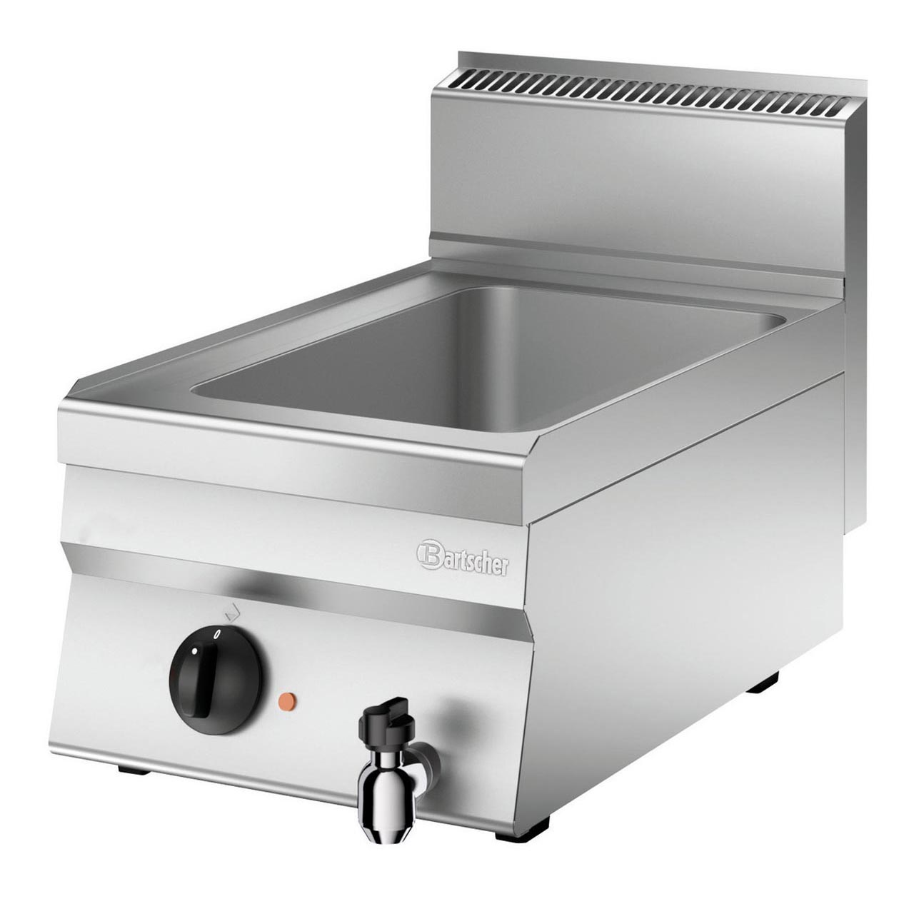 Stolní vodní lázeň řady 650 Bartscher pro profi kuchyně. Vyrobená z chromniklové nerezové oceli 18/10. Pro gastronádoby GN 1/1 hloubky 150 mm. Elektrická vodní lázeň s příkonem 1 kW / 230 V. Výpustný kohout, teplota 30-90 °C. Určena pro nepřetržitý provoz.