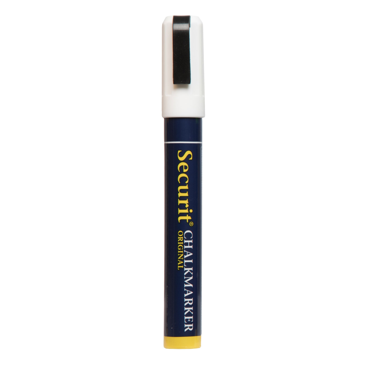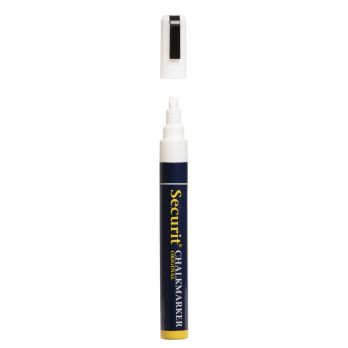 Křídový střední popisovač, šířka hrotu: 2 - 6 mm, bílý. Po uschnutí je odolný proti rozmazán, vyblednutí nebo smytí slabým deštěm. Čistí se houbičkou.