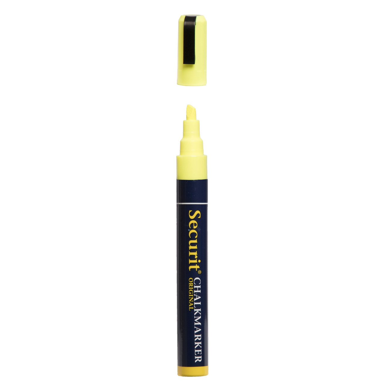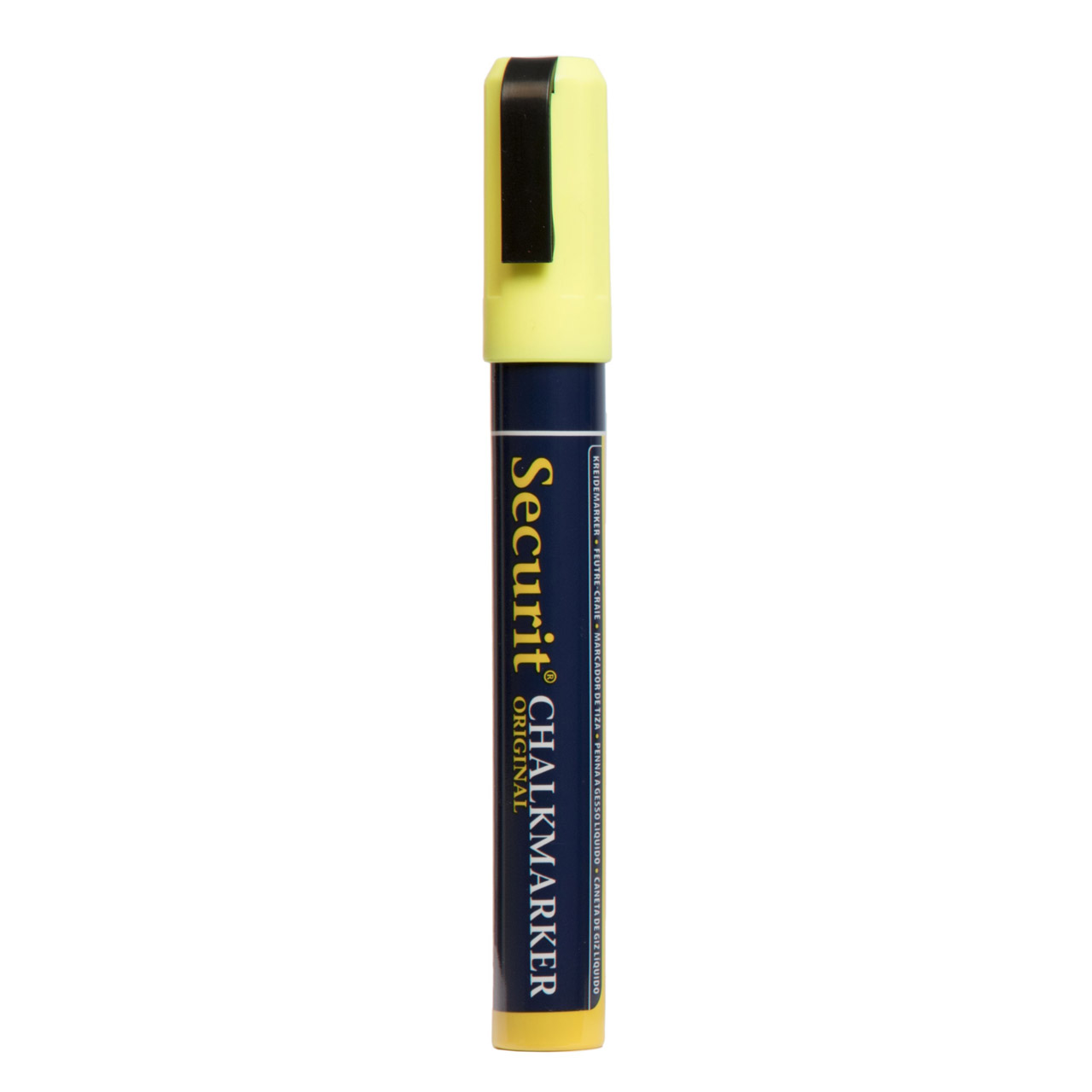 Křídový střední popisovač, šířka hrotu: 2 - 6 mm, žlutý. Po uschnutí je odolný proti rozmazán, vyblednutí nebo smytí slabým deštěm. Čistí se houbičkou.