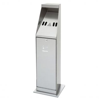Stojanový popelník z nerezové oceli. Jednoduché složení, uzamykatelný. Objem: cca 5,5 litru. Rozměry: 240 (Š) x 240 (H) x 870 (V) mm. Hmotnost: 8,5 kg.